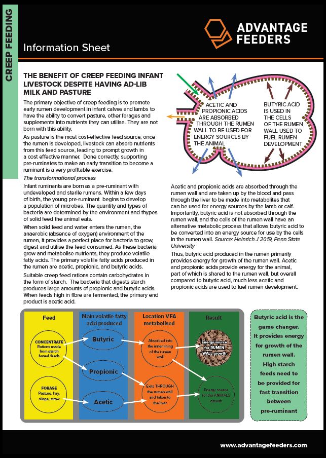Young animals are born with inactive rumens. Proactively intervening, by creep feeding, to transition the young animals’ rumen to eat pasture at a much young age allows them to grow a lot faster. This increases their ability to reach target weights before pasture quality deteriorates and reduces the number of stock needing to be finished in a high cost system. Our research has shown that supplementing 750g/day has increased weaning weights by more than 200g/day.