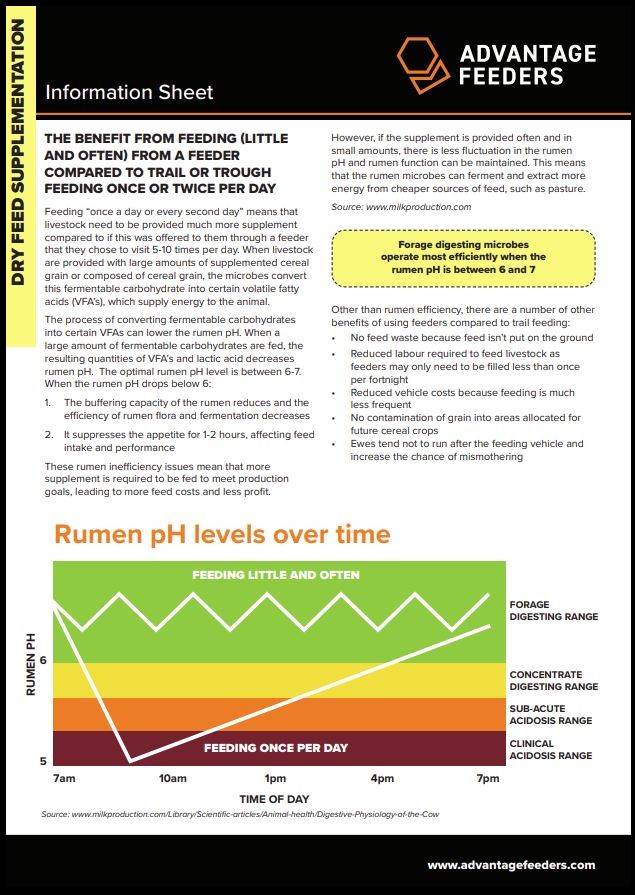 At stages through the year, ruminants need supplementation to be productive. The way the supplement is provided has a big impact on the animal because most supplements are high in starch and adding starch into the rumen can lower the pH, kill off microflora and lead to a decrease in productivity. It can be important to productivity that the supplement is provided in little and often amounts, so the amount of starch digested at any stage is not enough to change the pH much and affect productivity. Our research has shown that supplementing with 45% less feed through Advantage Feeders, compared to trail feeding, can have the same production.